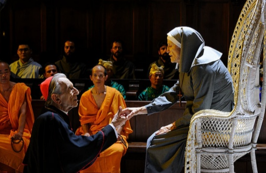 전자음악이 울려 퍼지는 파티 장면과, 수도원의 고요한 성가 장면은 극적인 대조를 이룬다.