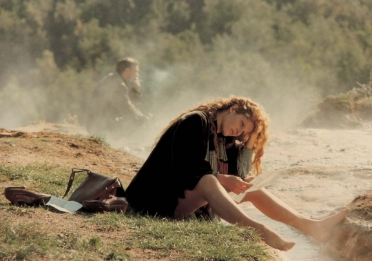 화면은 광각으로 펼쳐진 언덕과 구부러진 나무들을 보여주고, 두 사람의 움직임은 마치 시간마저 잊은 듯 느릿하다.