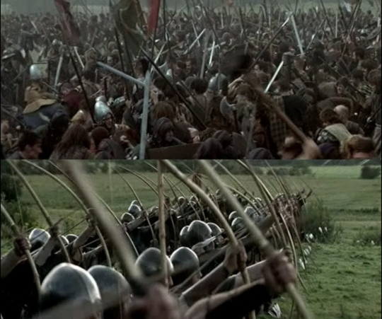 잉글랜드 기병대가 먼지구름을 일으키며 달려오고, 스코틀랜드 병사들은 긴 창을 들고 떨리는 손을 감춘다.