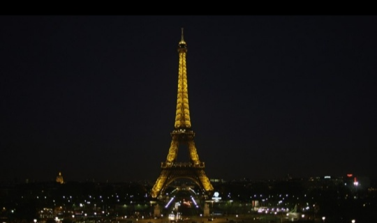 어두운 하늘을 배경으로 에펠탑이 은빛 조명을 반짝이며 서 있다. 파리의 밤은 차갑고도 낭만적이다.