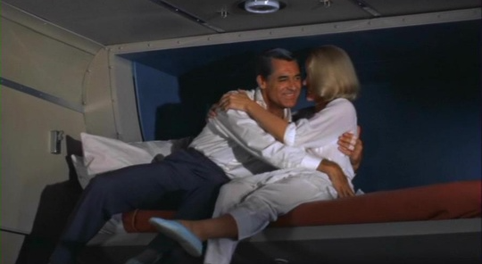 로저가 이브의 손을 잡고 기차 침대로 끌어올리는 장면은, 두 사람의 재회와 안정을 상징한다.