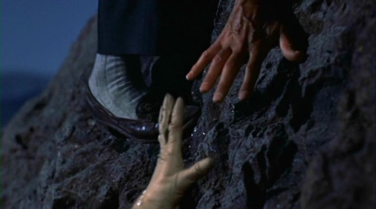 이브가 절벽 아래로 미끄러지는 순간, 로저는 그녀의 손을 붙잡는다.